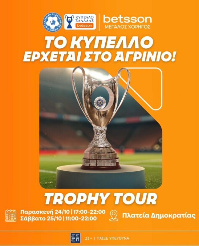 Μετά από μια δυναμική εκκίνηση στη Λάρισα, το Trophy Tour του Κυπέλλου Ελλάδας Betsson συνεχίζει το ταξίδι του με επόμενη στάση το Αγρίνιο!