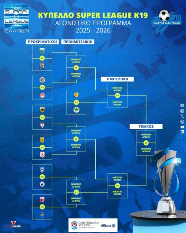 Σήμερα, Δευτέρα, 13 Οκτωβρίου 2025, στα γραφεία της Super League, πραγματοποιήθηκε η κλήρωση του Κυπέλλου Super League K19 για την αγωνιστική περίοδo 2025-26 και την παρακολούθησαν με φυσική παρουσία, αλλά και διαδικτυακά, εκπρόσωποι των Π.Α.Ε. Μελών της Super League.