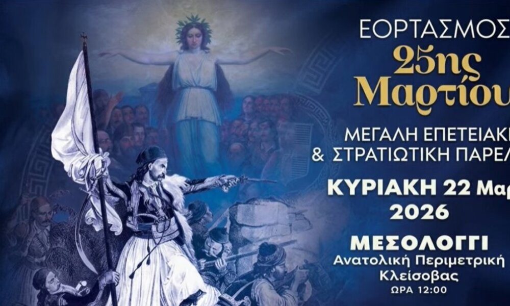 Στο Μεσολόγγι από νωρίς το πρωί της Κυριακής, 22 Μαρτίου 2026 οι εκδηλώσεις για τον Εορτασμό της 25ης Μαρτίου – Δείτε live την Πολιτική και Στρατιωτική Παρέλαση.