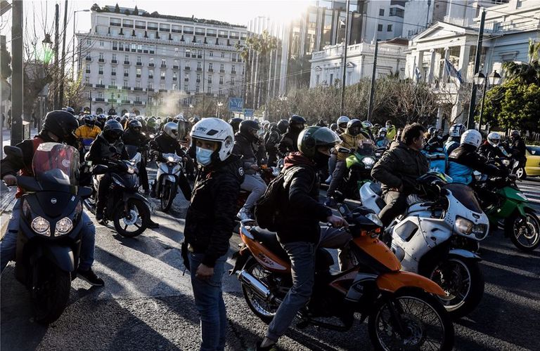 Μοτοπορεία στο κέντρο της Αθήνας πραγματοποιούν διανομείς το απόγευμα της Τετάρτης, με αφορμή το τροχαίο που σημειώθηκε την προηγούμενη εβδομάδα έξω από τη Βουλή.