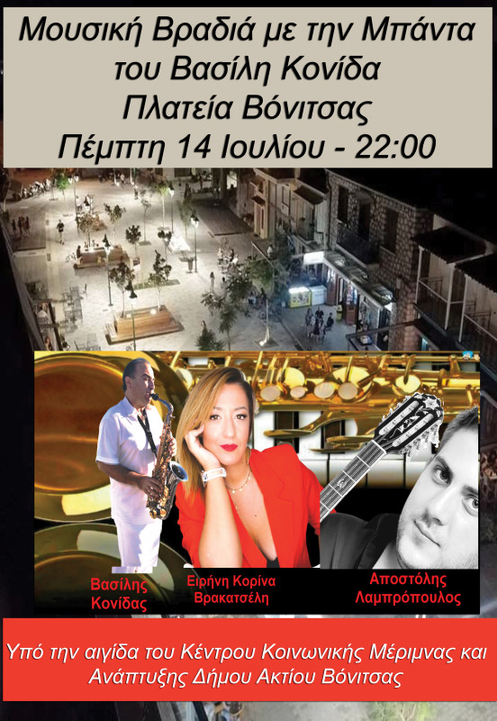 Στις 14 Ιουλίου η μουσική πανδαισία των πολιτιστικών εκδηλώσεων του Δήμου Ακτίου Βόνιτσας μεταφέρεται στην Κεντρική Πλατεία της Βόνιτσας.