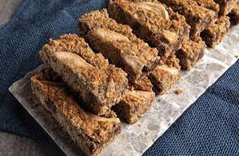 Ξεφλουδίζουμε το άλλο αχλάδι, κόβουμε σε λεπτές φέτες και απλώνουμε πάνω από το μείγμα. Ψήνουμε για 40-50 λεπτά.