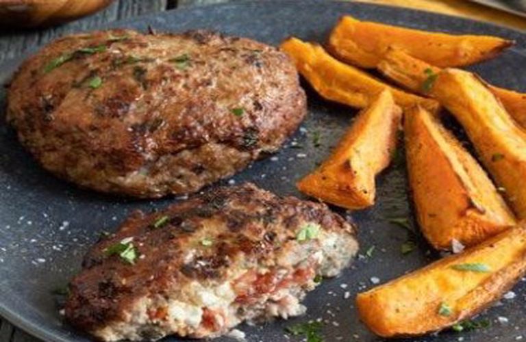 Σερβίρουμε τα μπιφτέκια με μουστάρδα, κέτσαπ και τσιπς γλυκοπατάτας και πασπαλίζουμε με ψιλοκομμένο μαϊντανό.