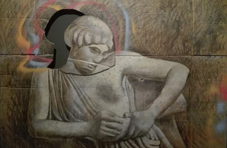 Χάρτινες κούτες, ποικίλων διαστάσεων, που ο ίδιος ο καλλιτέχνης περιμάζεψε από τον δρόμο, χρησιμοποιήθηκαν ως καμβάς για την ελεύθερη απόδοση αρχαίων γλυπτών. Από τις επίπεδες χάρτινες επιφάνειες αναδύονται αρχαϊκές μορφές κατακερματισμένες, υποδηλώνοντας την ανησυχία του Σάμιου για τη διαχείριση του παρελθόντος. Κυκλαδικά ειδώλια, αρχαϊκές και κλασικές γλυπτικές δημιουργίες, πλαισιώνονται με πολύχρωμα γκράφιτι, που ζωγράφισε στο περιθώριο με σπρέι ο Σάμιος, επιχειρώντας να γεφυρώσει την ακτινοβολία της αρχαίας γλυπτικής τέχνης με την καθημερινότητα των δρόμων της σύγχρονης Αθήνας.