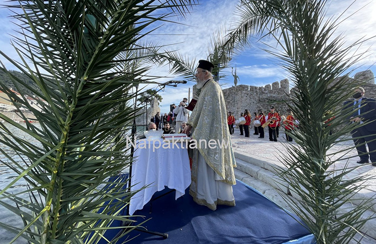 Μετά την τέλεση του Αγιασμού,κατά μόνας και χωρίς πομπή στους δρόμους της πόλης κλήρος,αρχές και πιστοί μετέβησαν στο λιμάνι της Ναυπάκτου,όπου τελέστηκε ο καθαγιασμός των υδάτων και η ρίψη του Σταυρού στη Θάλασσα.