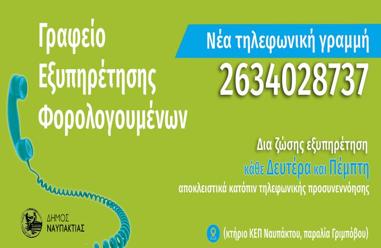Ο Δήμος Ναυπακτίας ενημερώνει ότι, το Γραφείο Εξυπηρέτησης Φορολογουμένων διαθέτει νέα τηλεφωνική γραμμή: 26340 28737.