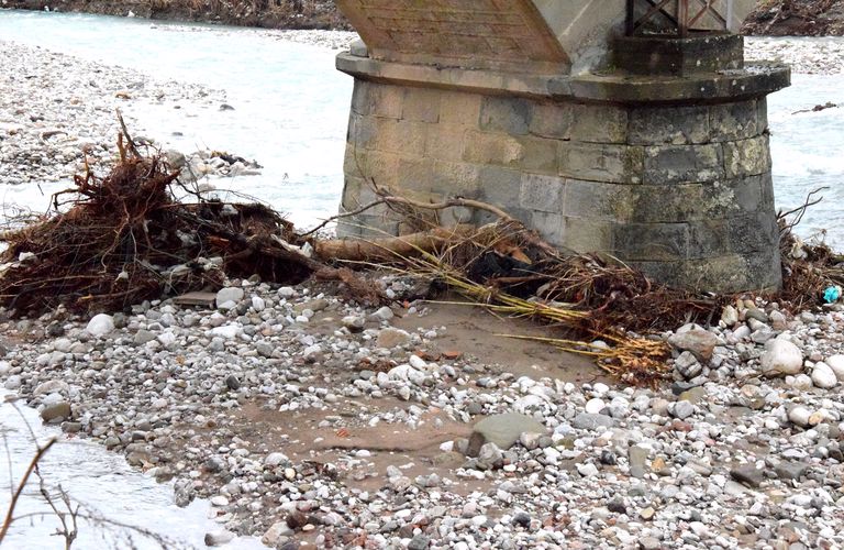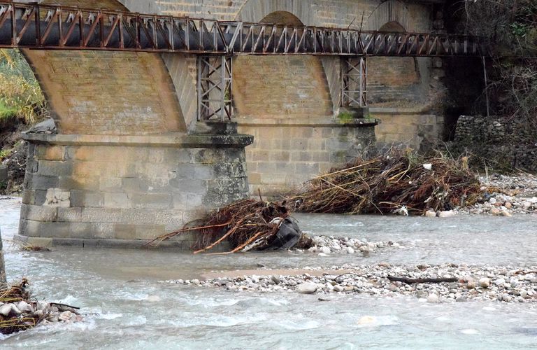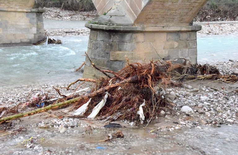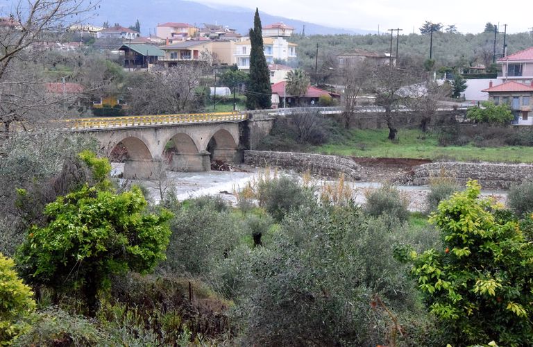 Στις φωτογραφίες φαίνεται η ζημιά που έγινε καθώς και οι κορμοί δένδρων και κλαδιών που εγκλωβίστηκαν στις καμάρες της γέφυρας.