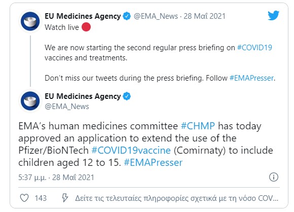Έγκριση για χρήση του εμβολίου Covid-19 της Pfizer στην ηλικιακή ομάδα των 12-15 ετών έδωσε την Παρασκευή ο Ευρωπαϊκός Οργανισμός Φαρμάκων (ΕΜΑ), έπειτα από την αντίστοιχη απόφαση της αμερικανικής Υπηρεσίας Τροφίμων και Φαρμάκων (FDA).