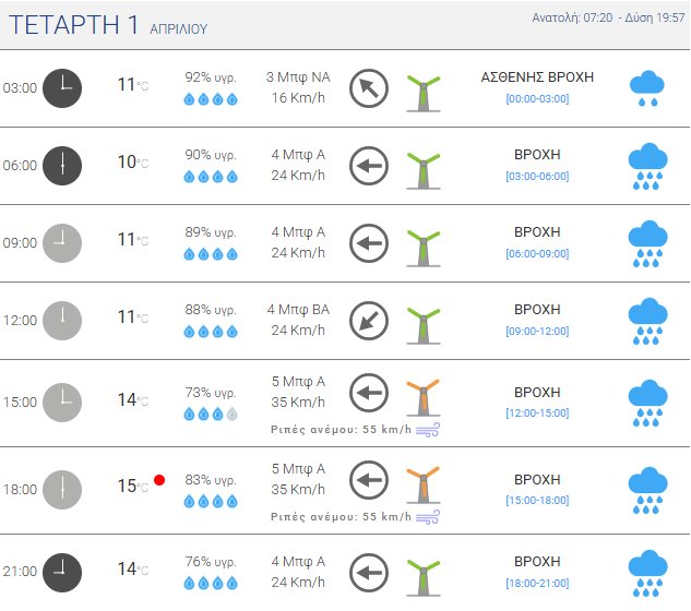Πιο αναλυτικά, την Τετάρτη, 1 Απριλίου 2026 τις πρώτες πρωινές ώρες, αναμένονται βροχές και καταιγίδες κυρίως στα Επτάνησα και στη Δυτική Ελλάδα, τοπικά στην Ανατολική Μακεδονία και Θράκη, καθώς και στην Κρήτη. Τα φαινόμενα γρήγορα θα επεκταθούν και στην υπόλοιπη χώρα, με την κεντρική και ανατολική ηπειρωτική χώρα, την Ανατολική και Νότια Πελοπόννησο, τις Κυκλάδες, την Κρήτη, καθώς και το Ανατολικό και Νότιο Αιγαίο να επηρεάζονται σημαντικά. Τις βραδινές ώρες, τα φαινόμενα θα ενταθούν στα κεντρικά, ανατολικά και βόρεια τμήματα της ηπειρωτικής χώρας, στα Δωδεκάνησα και στα νησιά του Ανατολικού και Βόρειου Αιγαίου. Χαλαζοπτώσεις αναμένονται τις πρώτες πρωινές ώρες στα Επτάνησα και τη Δυτική Ελλάδα, ενώ από το απόγευμα στη Νότια Πελοπόννησο, στην Κρήτη, στις Κυκλάδες και στα Δωδεκάνησα. Χιονοπτώσεις θα εκδηλωθούν στα ορεινά των βόρειων ηπειρωτικών τμημάτων της χώρας. Τα φαινόμενα θα είναι τοπικά έντονα. Υψηλές συγκεντρώσεις σκόνης αναμένονται στην Κρήτη, στην Δυτική Ελλάδα, στην Πελοπόννησο, στις Κυκλάδες, στα Δωδεκάνησα, στα κεντρικά ηπειρωτικά και από τις απογευματινές ώρες στη Μακεδονία, στη Θράκη και στα νησιά του Ανατολικού και Βόρειου Αιγαίου.