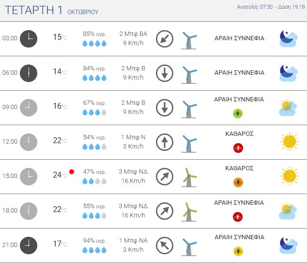 Την Τετάρτη, 1 Οκτωβρίου 2025 αναμένονται βροχές και καταιγίδες κατά τόπους. Σχετικά χαμηλές για την εποχή θερμοκρασίες. Άνεμοι έως 5 μποφόρ στο Αιγαίο.