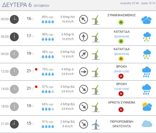 Τη Δευτέρα, 6 Οκτωβρίου 2025 αναμένονται βροχές και καταιγίδες. Σχετικά χαμηλές για την εποχή θερμοκρασίες στα δυτικά και βόρεια. Άνεμοι έως 7 μποφόρ στο Ιόνιο.