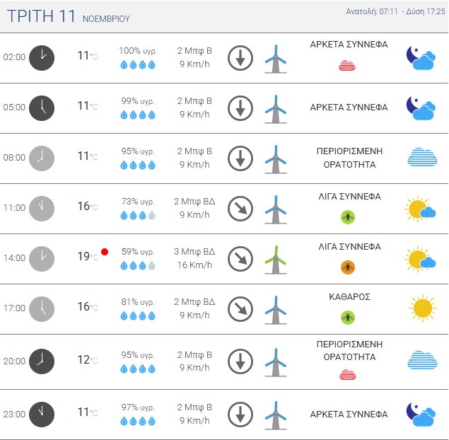 Για την Τρίτη, 11 Νοεμβρίου 2025 προβλέπονται νεφώσεις κατά διαστήματα αυξημένες, με βροχές και τοπικές καταιγίδες τις πρωινές ώρες στα νησιά του Ανατολικού Αιγαίου, στα Δωδεκάνησα, στις Κυκλάδες, στην Ανατολική Μακεδονία, στη Θράκη και πιθανόν στην Κρήτη.