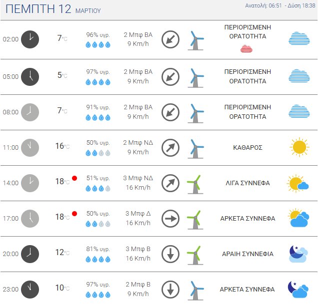 Πιο αναλυτικά, την Πέμπτη, 12 Μαρτίου 2026 αναμένονται νεφώσεις κατά διαστήματα αυξημένες στα Δυτικά και τα Ανατολικά με τοπικές βροχές και μεμονωμένες καταιγίδες στα Ηπειρωτικά Ορεινά το μεσημέρι και το απόγευμα.