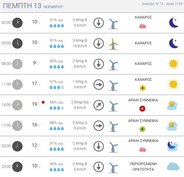 Για την Πέμπτη, 13 Νοεμβρίου 2025 προβλέπονται λίγες νεφώσεις κατά διαστήματα αυξημένες στα Ανατολικά και Νότια, με πιθανότητα τοπικών βροχών στα Βόρεια και Ορεινά Τμήματα της Κρήτης.