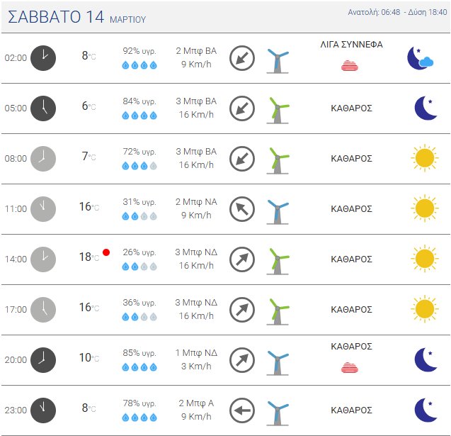 Πιο αναλυτικά, το Σάββατο, 14 Μαρτίου 2026 αναμένονται νεφώσεις στα ηπειρωτικά, τις Κυκλάδες και την Κρήτη. Τοπικές βροχές θα εκδηλωθούν στα ηπειρωτικά ορεινά, την Πελοπόννησο και την Κρήτη κυρίως τις μεσημεριανές και απογευματινές ώρες. Η ορατότητα θα είναι κατά τόπους περιορισμένη στα ηπειρωτικά τις πρωινές και τις βραδινές ώρες.