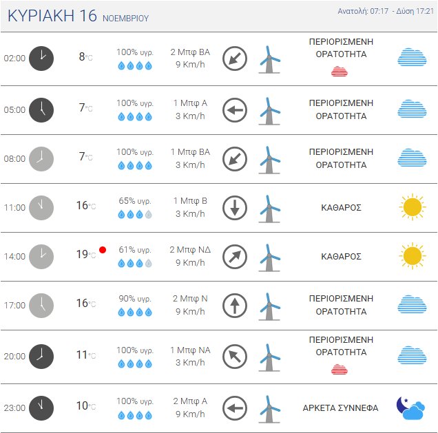 Για την Κυριακή, 16 Νοεμβρίου 2025 προβλέπεται ηλιοφάνεια με λίγες νεφώσεις, ενώ η ορατότητα τις πρωινές και βραδινές ώρες θα είναι κατά τόπους περιορισμένη και θα σχηματιστούν ομίχλες.