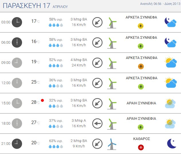 Λασποβροχές και καταιγίδες στις Κυκλάδες και κυρίως στην Κρήτη και στα Δωδεκάνησα. Ασθενείς τοπικές λασποβροχές στην υπόλοιπη χώρα. Αυξημένες συγκεντρώσεις Αφρικανικής σκόνης, ιδιαίτερα στην Κρήτη και στις Κυκλάδες. Βόρειοι άνεμοι 6-8 μποφόρ στο Αιγαίο.