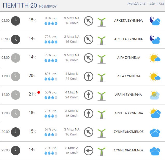 Την Πέμπτη, 20 Νοεμβρίου 2025 αναμένονται βροχές και καταιγίδες, κυρίως στα δυτικά και βόρεια. Υψηλές για την εποχή θερμοκρασίες. Άνεμοι έως 7 μποφόρ στο Ιόνιο.