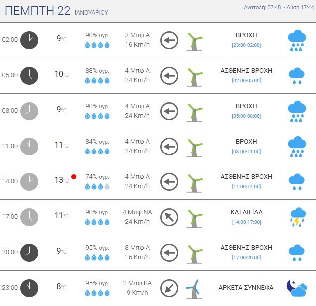 Πιο αναλυτικά, την Πέμπτη, 22 Ιανουαρίου 2026 προβλέπονται βροχές και καταιγίδες στα δυτικά και τα νότια και σταδιακά στα ανατολικά, οι οποίες θα είναι τοπικά ισχυρές στη Νότια Πελοπόννησο, την Ανατολική Αττική, την Εύβοια, τα νησιά του Βόρειου και Ανατολικού Αιγαίου και από τις βραδινές ώρες στην Κρήτη. Χιονοπτώσεις θα σημειωθούν στα κεντρικά και βόρεια ηπειρωτικά ορεινά.