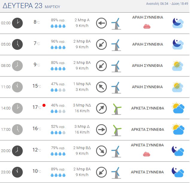 Τη Δευτέρα, 23 Μαρτίου 2026 αναμένονται τοπικές βροχές κυρίως στα ορεινά. Θερμοκρασία σε χαμηλά για την εποχή επίπεδα. Άνεμοι έως 6 μποφόρ στο Αιγαίο.