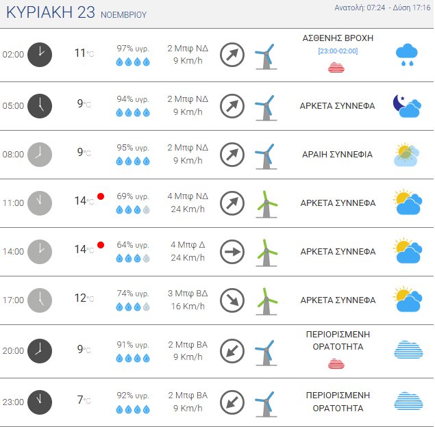 Την Κυριακή, 23 Νοεμβρίου 2025 αναμένονται βροχές και καταιγίδες κυρίως στα δυτικά. Υψηλές για την εποχή μέγιστες θερμοκρασίες στα βόρεια. Άνεμοι έως 7 μποφόρ στο Ιόνιο.