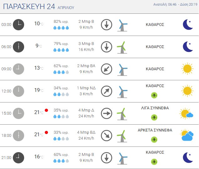 Την Παρασκευή, 24 Απριλίου 2026 αναμένονται τοπικές βροχές στα νότια και γενικά αίθριος καιρός στην υπόλοιπη χώρα. Μικρή άνοδος της θερμοκρασίας. Άνεμοι έως 6 μποφόρ στο Βόρειο Ιόνιο.
