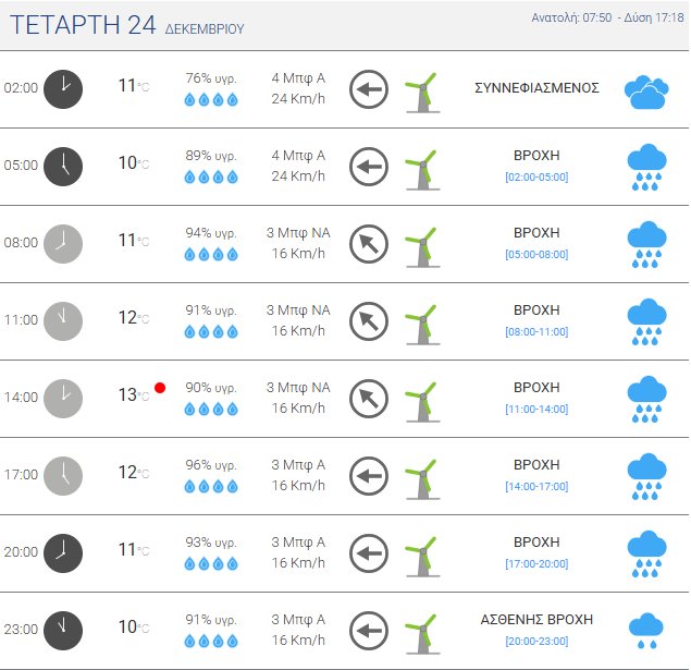 Νεφώσεις παροδικά αυξημένες με βροχές περιμένουμε την Τετάρτη (Παραμονή Χριστουγέννων) στη Θεσσαλονίκη. Η θερμοκρασία θα κυμανθεί από 8 έως 11 βαθμούς Κελσίου. Οι άνεμοι στο Θερμαϊκό θα πνέουν από ανατολικές διευθύνσεις μέτριοι 4-5 μποφόρ, που μετά το μεσημέρι θα στραφούν σε βορειοδυτικούς ασθενείς έως σχεδόν μέτριους 3-4 μποφόρ.