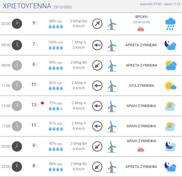 Για την Πέμπτη, 25 Δεκεμβρίου 2025 (Χριστούγεννα) προβλέπονται βροχές και τοπικές καταιγίδες στα Ανατολικά Ηπειρωτικά, Εύβοια, Σποράδες, Νησιά του Ανατολικού Αιγαίου, Δωδεκάνησα και στο Ιόνιο.