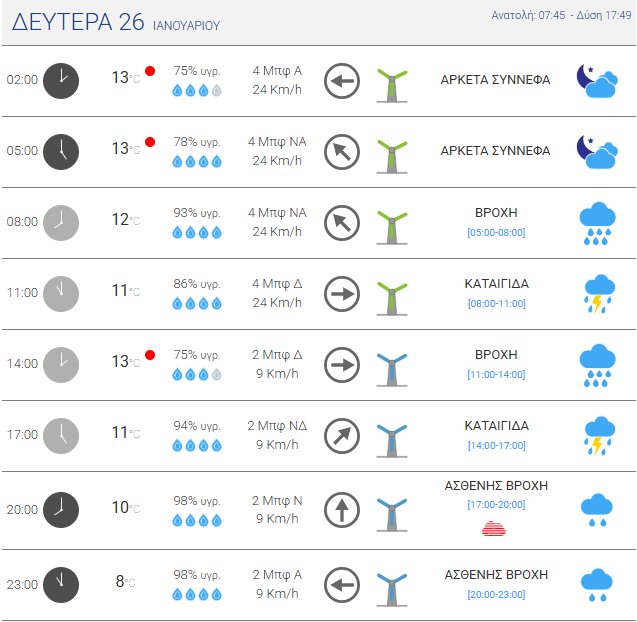 Πιο αναλυτικά τη Δευτέρα, 26 Ιανουαρίου 2026 προβλέπονται βροχές και καταιγίδες κατά τόπους ισχυρές στα Δυτικά, τα Βόρεια, τα Ανατολικά Ηπειρωτικά, την Εύβοια, τις Κυκλάδες, τα Νησιά του Ανατολικού Αιγαίου και τα Δωδεκάνησα.