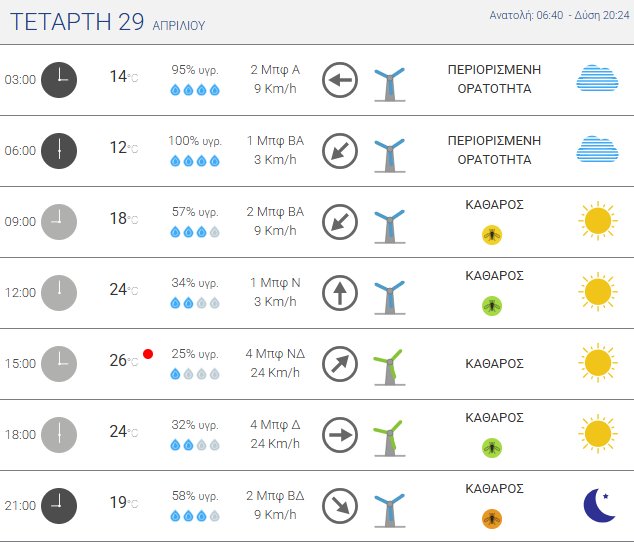 Για την Τετάρτη, 29 Απριλίου 2026 προβλέπεται ηλιοφάνεια με λίγες νεφώσεις, αυξημένες τις θερμές ώρες της ημέρας στα Ορεινά Ηπειρωτικά με τοπικούς όμβρους ή μεμονωμένες καταιγίδες στα Ορεινά της Μακεδονίας, της Ηπείρου και της Κεντρικής Στερεάς.