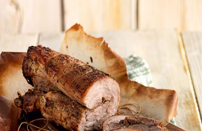Προθερμαίνετε το φούρνο στους 250οC. Βάζετε στο ταψί τα φρέσκα αρωματικά και δύο – τρεις ολόκληρες σκελίδες σκόρδο. Από πάνω βάζετε μια σχάρα ώστε να μένει κενό ανάμεσα στη σχάρα και το ταψί. Τοποθετείτε το ρολό πάνω στη σχάρα και ρίχνετε το κρασί και το νερό μέσα στο ταψί.