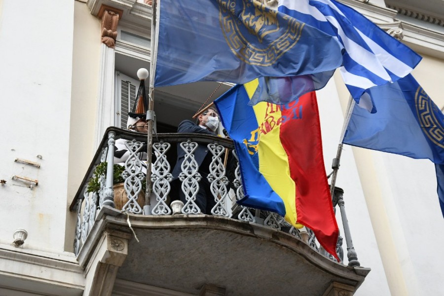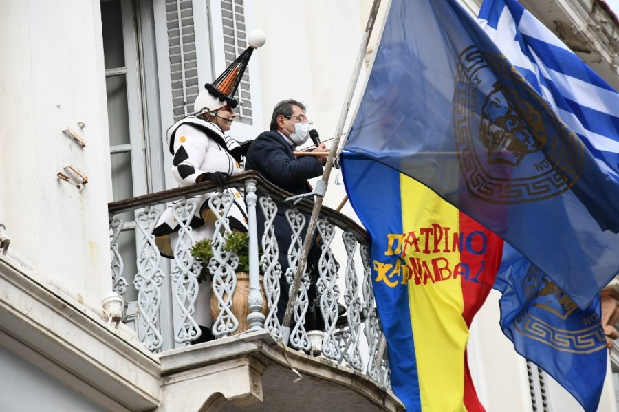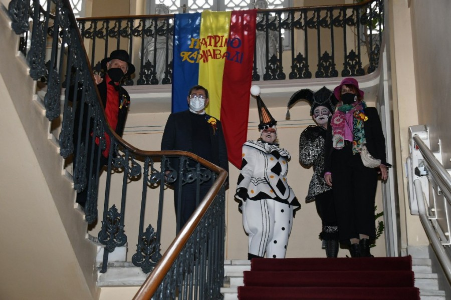 Σε μια λιτή, λόγω των μέτρων κατά της πανδημίας, τελετή που έγινε σήμερα το μεσημέρι στο Δημαρχείο, στην έναρξη της οποίας ο Δήμαρχος Πατρέων, Κώστας Πελετίδης, από το μπαλκόνι του Δημαρχείου, κάλεσε, για μια ακόμη φορά, όλους να τηρήσουν τις αποστάσεις και τα μέτρα που προβλέπονται κατά του Covid-19, η Πρόεδρος της Κοινωφελούς Δημοτικής Επιχείρησης «Καρναβάλι Πάτρας», Ήρα Κουρή, μετέφερε το καρναβαλικό λάβαρο έξω από το Δημοτικό μέγαρο και με τους ξυλοπόδαρους, που την συνόδευαν, το παρέδωσε στο Δήμαρχο.