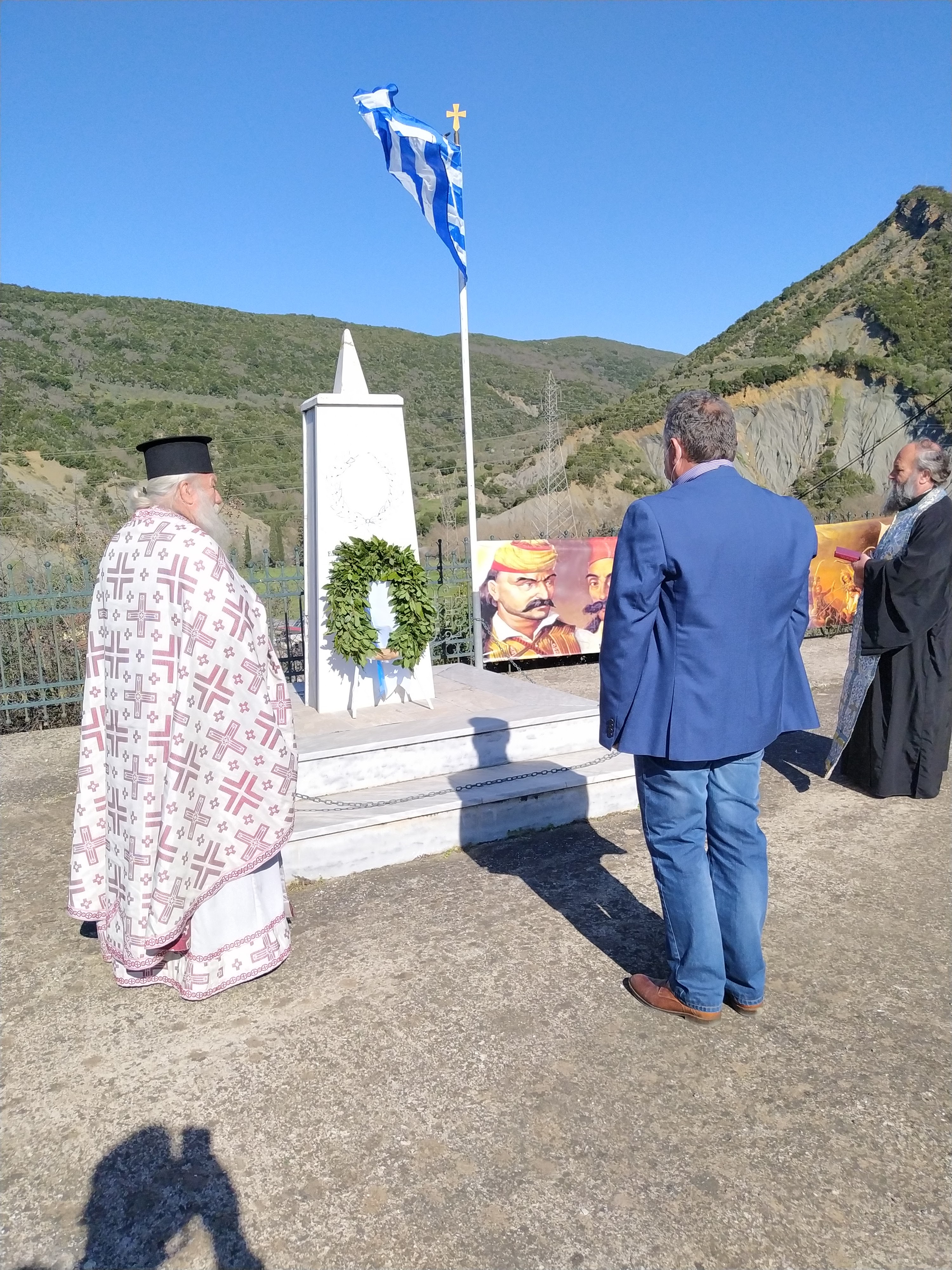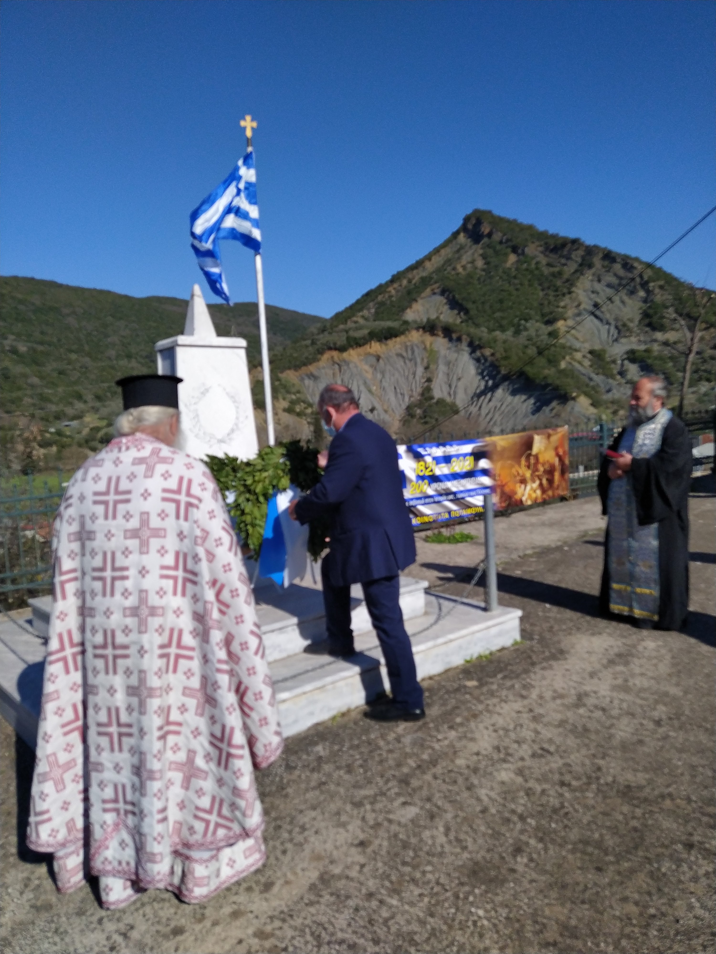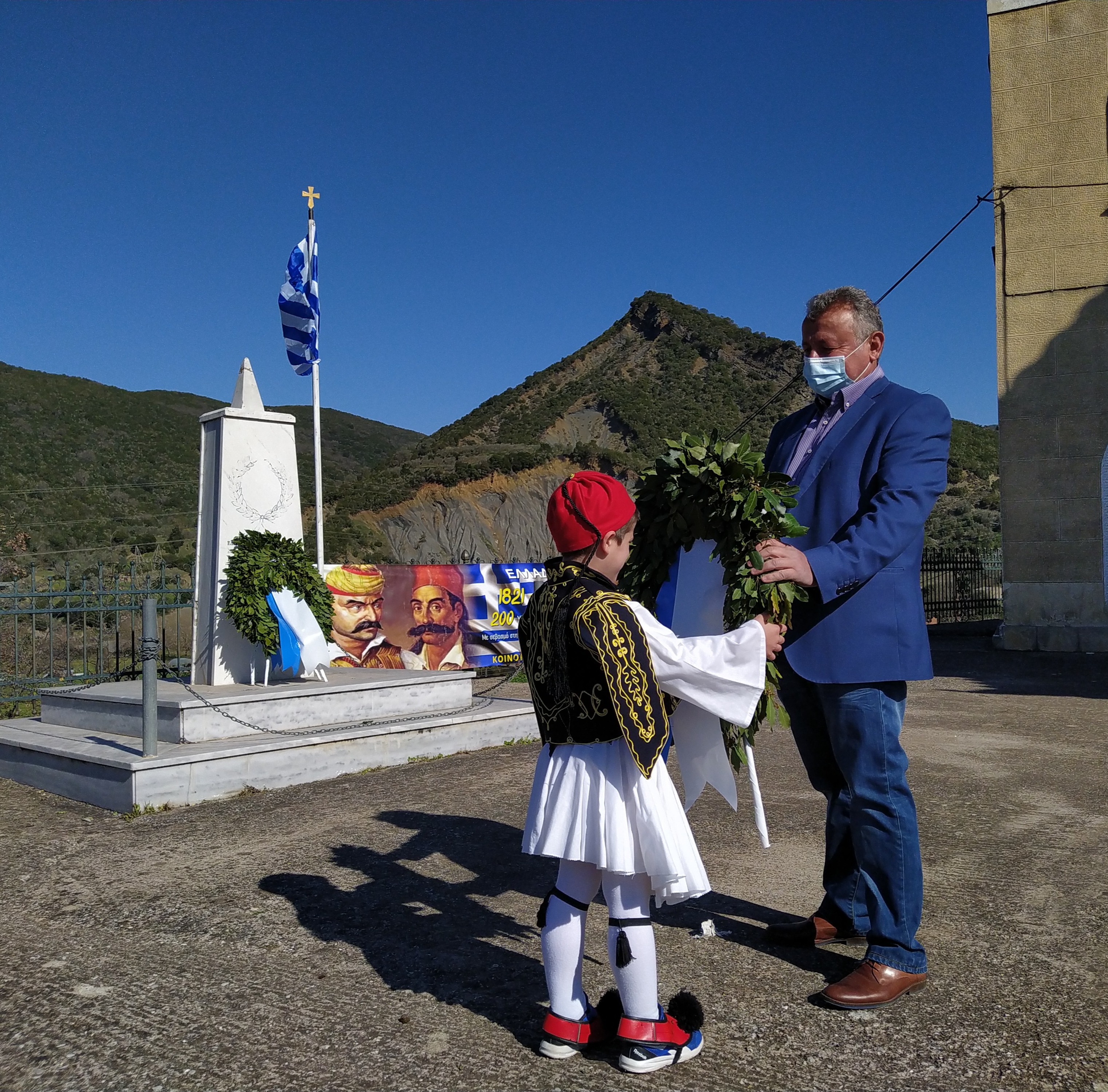 - Ο Πρόεδρος Τ.Κ Ποταμούλας Δημήτρης Ανδρώνης και ο Δημοτικός σύμβουλος Παρακαμπυλίων Κώστας Σοφρώνης και οι μικροί με φορεσιές που έδωσαν χρώμα και έννοια στην σημερινή εθνική εορτή κατέθεσαν Στεφάνι.