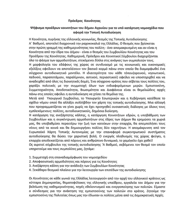 - Οι κάτωθι υπογεγραμμένοι πρόεδροι των Κοινοτήτων του Δήμου Αγρινίου, στο πλαίσιο της διαβούλευσης και ενόψει του νέου εκλογικού νόμου για την αλλαγή του εκλογικού συστήματος των αυτοδιοικητικών εκλογών, που θα αφορά στις επερχόμενες αυτοδιοικητικές εκλογές του 2023, σας υποβάλουμε ψήφισμα και την πρόταση μας για τις Κοινότητες του Δήμου και παρακαλούμε για την έγκριση του από το Δημοτικό συμβούλιο με την μορφή του ΚΑΤΕΠΕΙΓΟΝΤΟΣ και στην συνέχεια την αποστολή του προς την Κ.Ε.Δ.Ε. και στο Υπουργείο Εσωτερικών στον αρμόδιο Υπουργό Εσωτερικών, Μαυρουδή Βορίδη.