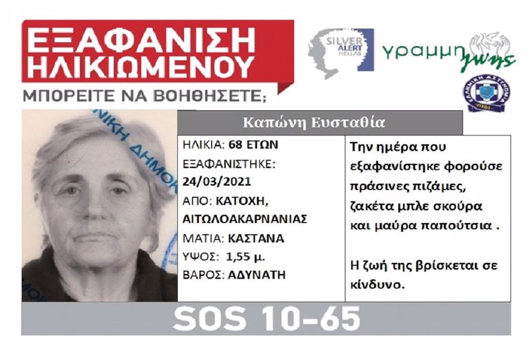 Η Ευσταθία Καπώνη 68 ετών στις 24/03/21 εξαφανίστηκε από το σπίτι της, στην Κατοχή Αιτωλοακαρνανίας.