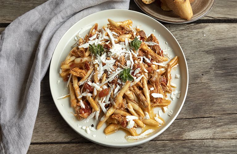 Κάνουμε το κοτόπουλο ψίχα με δύο πιρούνια και βάζουμε μέσα τα βρασμένα σκιουφιχτά.