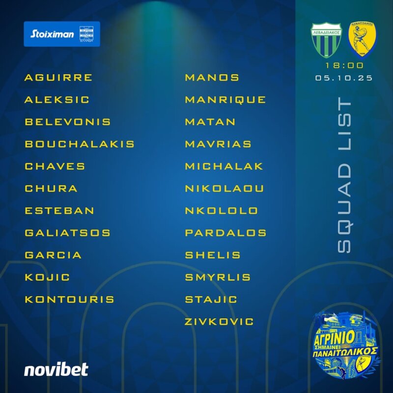 Στην αποστολή είναι και ο Λάζαρ Κόγιτς, εκτός όμως βρίσκονται οι: Αγαπάκης, Λουΐς, Μλάντεν, Αποστολόπουλος.