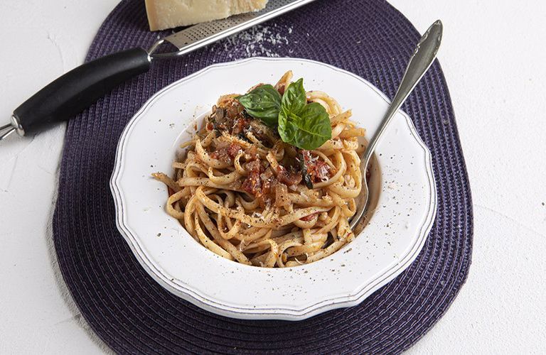 Ρίχνουμε τα ζυμαρικά στο τηγάνι με τη σάλτσα και ανακατεύουμε.