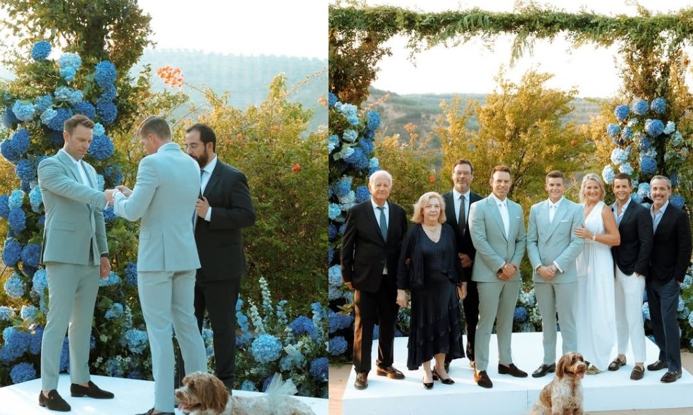 «Πριν από έναν χρόνο ακριβώς, στα Χανιά, σταθήκαμε μπροστά στους αγαπημένους μας και διαβάσαμε τους όρκους που σφράγισαν το κοινό πενταετές μας ταξίδι — λίγους μόνο μήνες αφότου είχαμε παντρευτεί νομικά στη Νέα Υόρκη, λίγο πριν η Ελλάδα αγκαλιάσει επιτέλους τον γάμο για όλους.