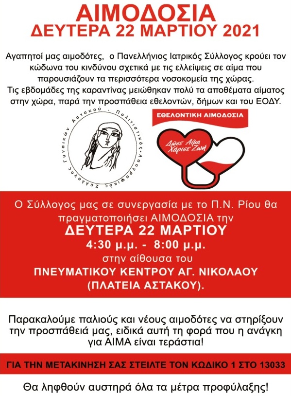 Ο Σύλλογος μας σε συνεργασία με το Π.Ν. Ρίου θα πραγματοποιήσει ΑΙΜΟΔΟΣΙΑ τη ΔΕΥΤΕΡΑ 22 ΜΑΡΤΙΟΥ 4:30 μ.μ. – 8:00 μ.μ. στην αίθουσα του ΠΝΕΥΜΑΤΙΚΟΥ ΚΕΝΤΡΟΥ ΑΓ. ΝΙΚΟΛΑΟΥ (ΠΛΑΤΕΙΑ ΑΣΤΑΚΟΥ).