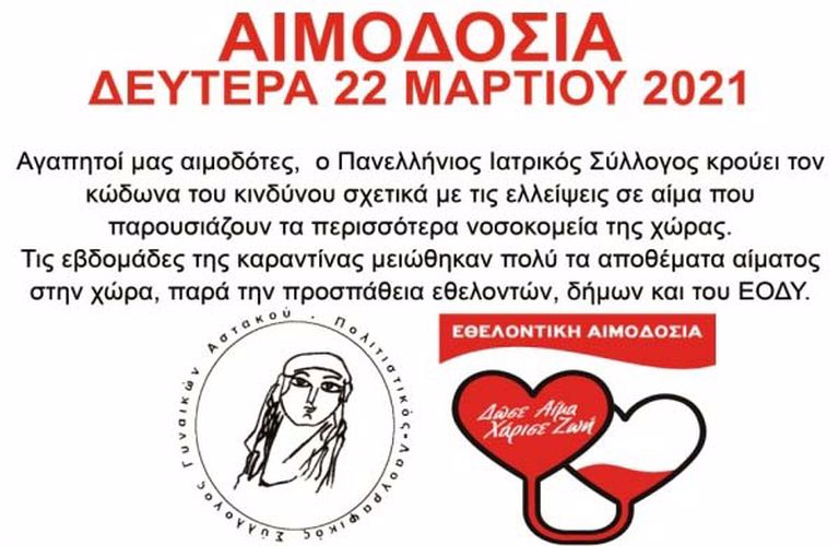 Σύλλογος Γυναικών Αστακού: Εθελοντική αιμοδοσία τη Δευτέρα 22 Μαρτίου – Επιτακτική ανάγκη για αίμα από τις μεγάλες ελλείψεις στα Νοσοκομεία
