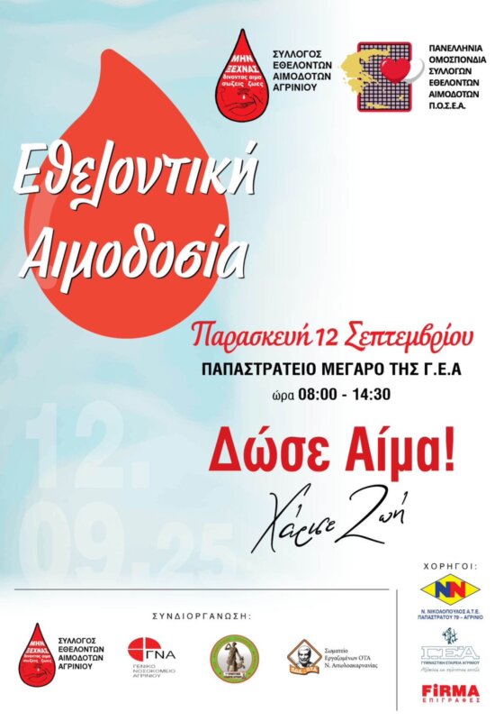 Ο Σύλλογος Εθελοντών Αιμοδοτών Αγρινίου και το Γενικό Νοσοκομείο Αιτωλοακαρνανίας Νοσηλευτική Μονάδα Αγρινίου (Τμήμα Αιμοδοσίας) οργανώνουν και καλούν όλους τους υγιείς συμπολίτες μας να συμμετέχουν στην Εθελοντική Αιμοδοσία, την Παρασκευή 12//09/2025 από τις 08:00 μέχρι τις 14:30 στο Παπαστράτειο Μέγαρο της Γυμναστικής Εταιρείας Αγρινίου.