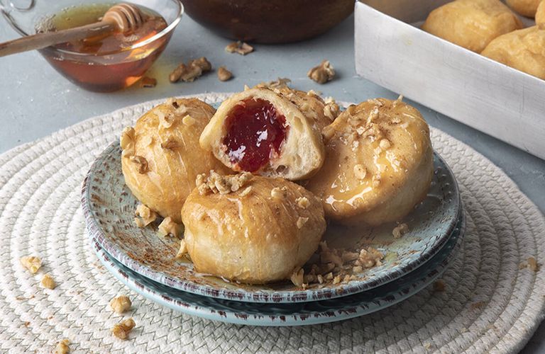 Περιχύνουμε τις τηγανίτες με μέλι και πασπαλίζουμε με σπασμένα καρύδια και κανέλα.