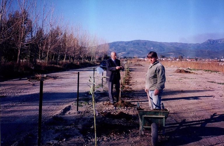 «Τα δέντρα του μπαμπά. Παρέλαβε το μέρος σκουπιδότοπο -ντροπή- δίπλα στη λιμνοθάλασσα της Κλείσοβας. Με την στήριξη του συλλόγου πρασίνου που εκπροσωπούσε ,τη θέληση, την επιμονή ,το πείσμα που τον χαρακτήριζαν και κυρίως τη λατρεία για την πόλη που τον γέννησε ,μεταμόρφωσε τον σκουπιδότοπο σε δασύλλιο .Φύτεψε και «μεγάλωσε» πολλές εκατοντάδες δέντρων στο μέρος αυτό -πεύκα, λεύκες, ευκαλύπτους και δάφνες. Είχε και τον εργάτη Φατμίρ για βοηθό ,που αυτοβαπτίστηκε Ηλίας και του έμαθε να αγαπάει το πράσινο και το Μεσολογγι. Ήταν πάντα παρών ,παρά την ηλικία και την φθαρμένη του υγεία -με ήλιο και με καύσωνα ,γιατί «τα καημένα τα δέντρα διψάνε και υποφέρουν και θέλουν φροντίδα». Τα κοίταζε τα δέντρα-παιδιά του και τα καμάρωνε πραγματικά. Η λιμνοθάλασσα για πολύ καιρό σταμάτησε να «συμβιώνει» με τα σκουπίδια.»