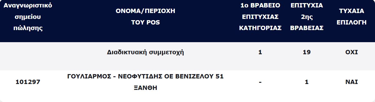 Από εκεί κι έπειτα 8 τυχεροί κέρδισαν 2.5000 έκαστος και φυσικά πολλά μικρότερα ποσά στις χαμηλότερες κατηγορίες…