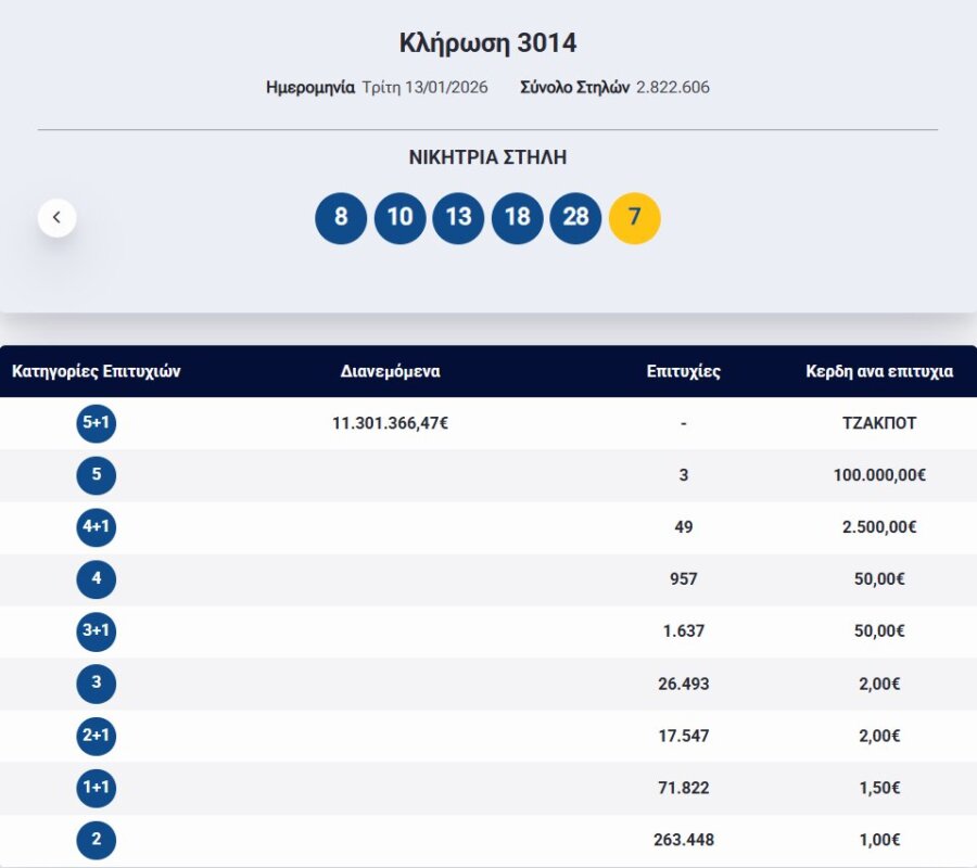 Σκεφτείτε τι θα μπορούσε να είχε συμβεί την 13η Ιανουαρίου 2026 αν το συγκεκριμένο πεντάρι είχε πετύχει και τον αριθμό Τζόκερ, όπως κι αν έχει το AgrinioTimes.gr εύχεται στον νικητή ή τη νικήτρια να τα αξιοποιήσει με τον καλύτερο δυνατό τρόπο.