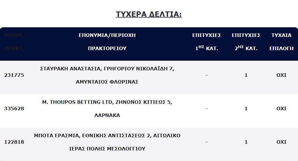 Ένας τυχερός ή μία τυχερή κατάφερε με μία μόλις στήλη που κόστισε 1 ευρώ και με αριθμούς που επέλεξε ο ίδιος ή η ίδια να δει στον τραπεζικό του/της λογαριασμό το ποσό των 100 χιλιάδων ευρώ.